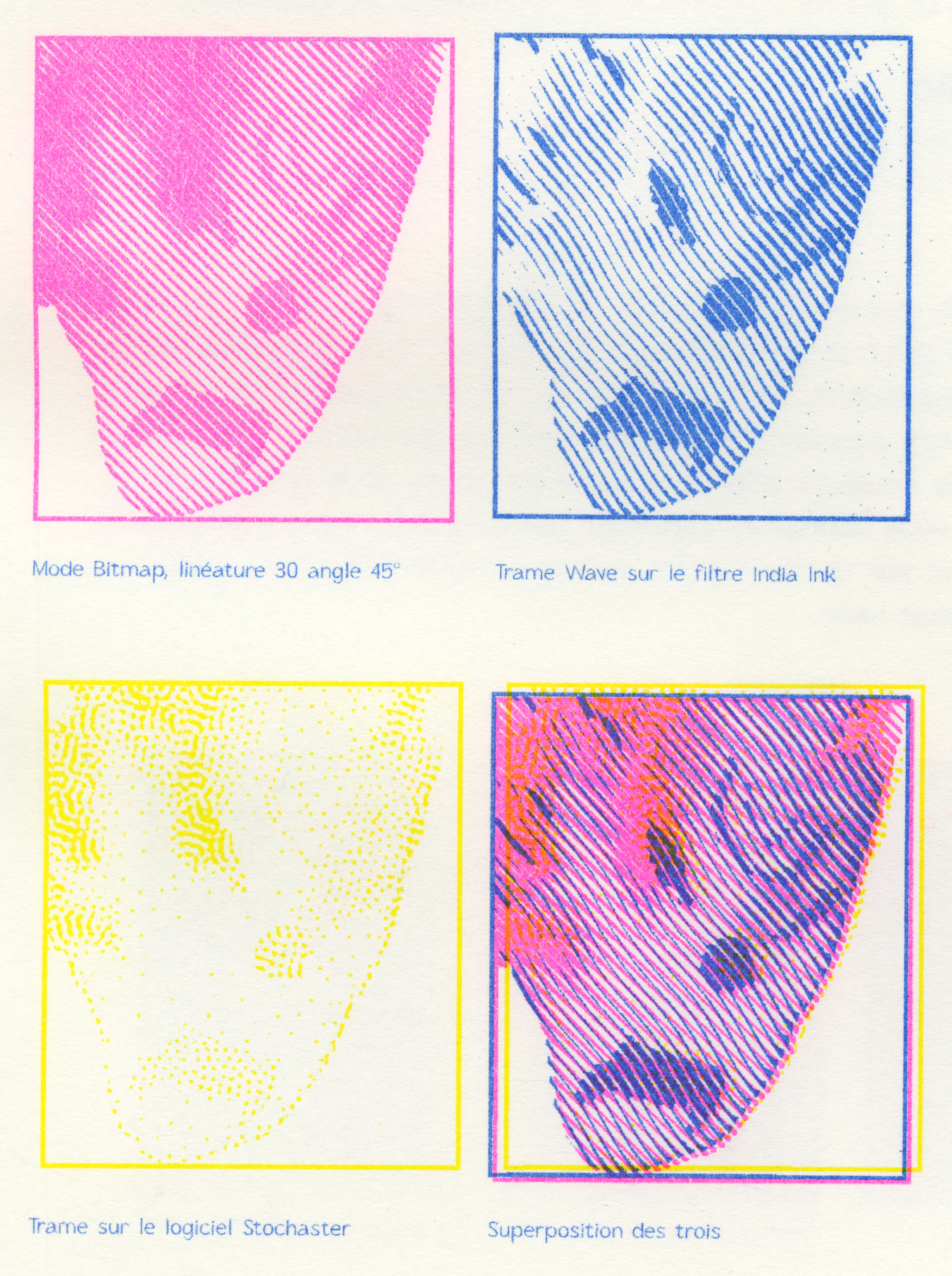 Par exemple, un bleu sur un rose donnera un violet plus ou moins intense selon la densité de la trame ou de l'aplat entre les deux couches. Pour se faire une idée du rendu, il est possible de mettre les calques en mode produit sur Photoshop ou alors directement régler l'opacité sur zéro via l'onglet uniformité que l'on met à 0% sur la couche de ton direct lorsque l'on travaille en multicouche.