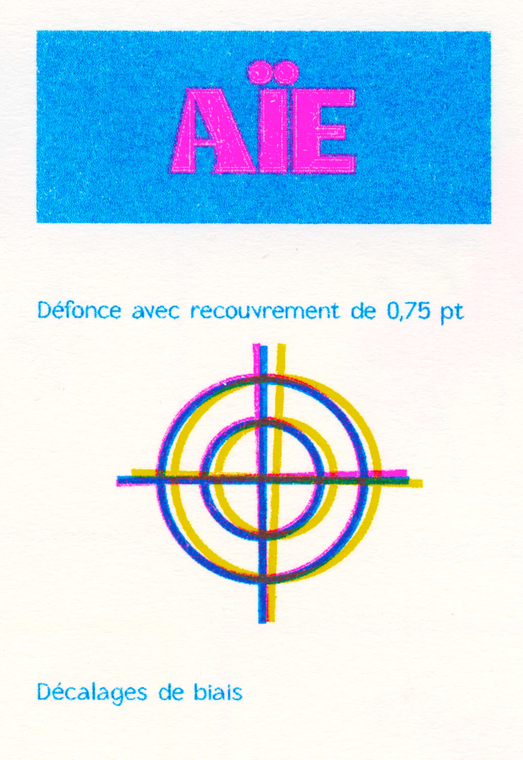 Un léger décalage entre chaques couches est toujours à prévoir. Il est possible de préparer ses fichiers en fonction de ces paramètres afin d'éviter des zones apparentes ou en réserve non désirées lors d'une impression en plusieurs couleurs. S'il y a des éléments en défonce, il est possible d'appliquer un recouvrement entre les deux zones de quelques points pour ne pas laisser le blanc du papier apparaître. Pour rendre le recouvrement moins visible, il est conseillé de faire déborder la couleur la plus claire sur la zone plus foncée.