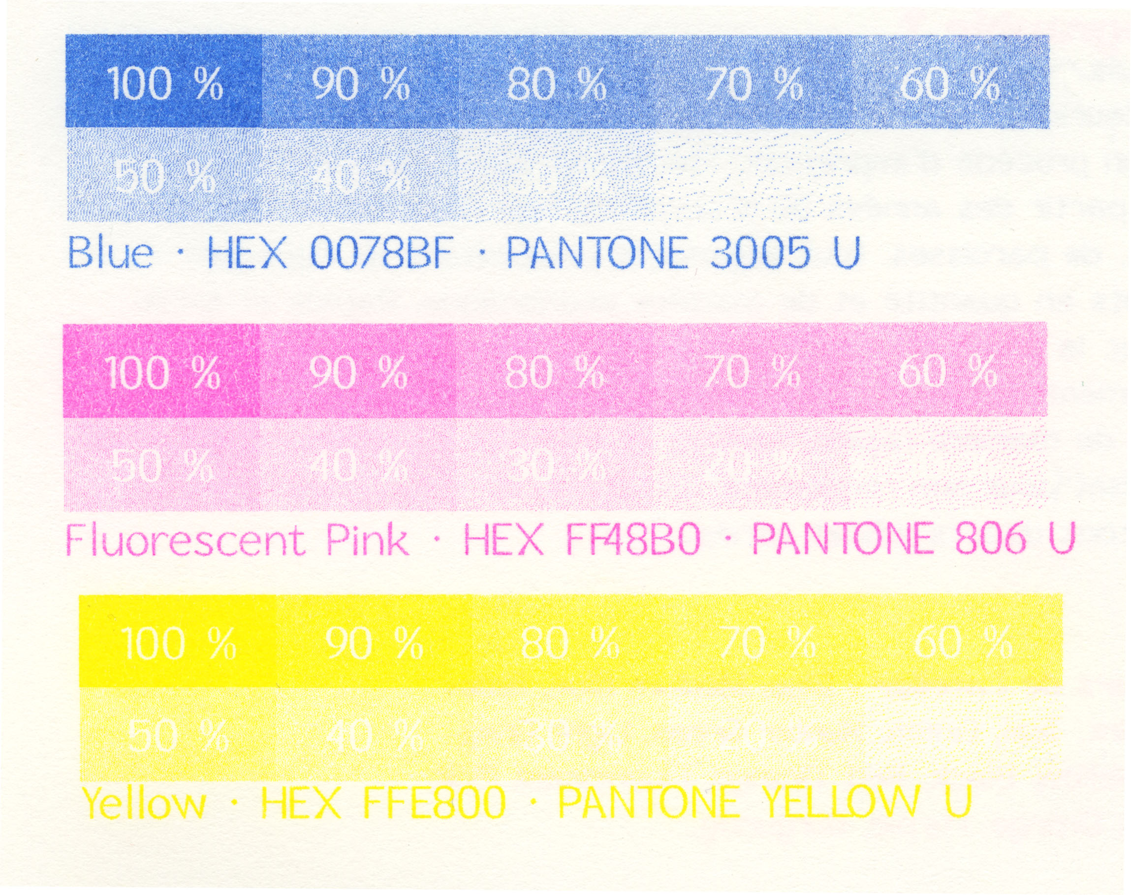 Il est cependant possible d'en simuler l'aperçu sur logiciel en se référant par exemple à la page stencil.wiki/colors qui indique des correspondances aux normes Pantone. Par exemple la couleur FLUORESCENT PINK peut se référer à 806 U (Pantone) dans les tons directs en travaillant en multicouche ou également à la valeur hexadécimale (HEX) #FF48B0.