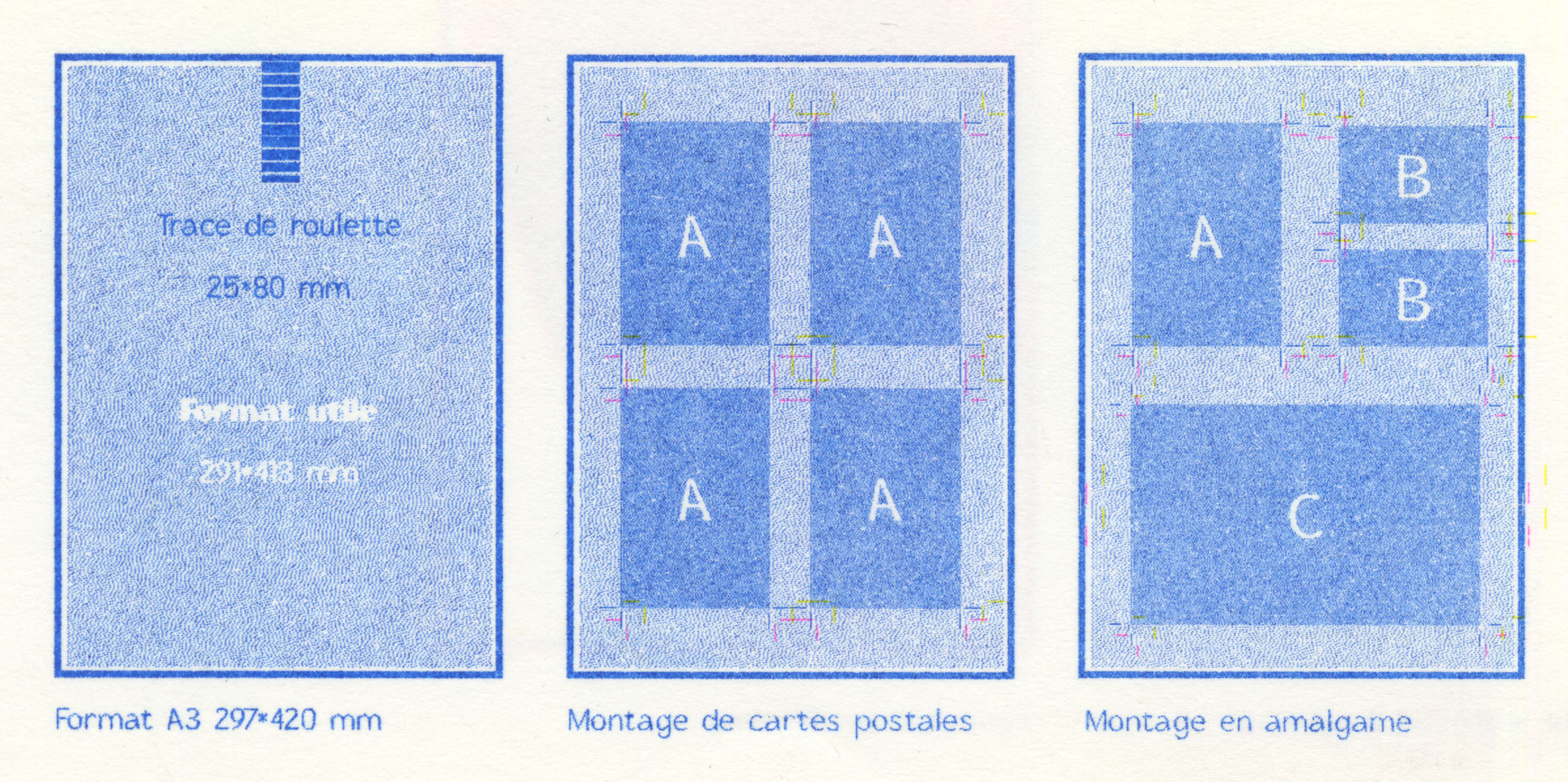 Ou alors, de faire un montage dit amalgame qui consiste à imprimer sur une même feuille différents travaux d'impression qui présentent les mêmes paramêtres de couleur et de papier.